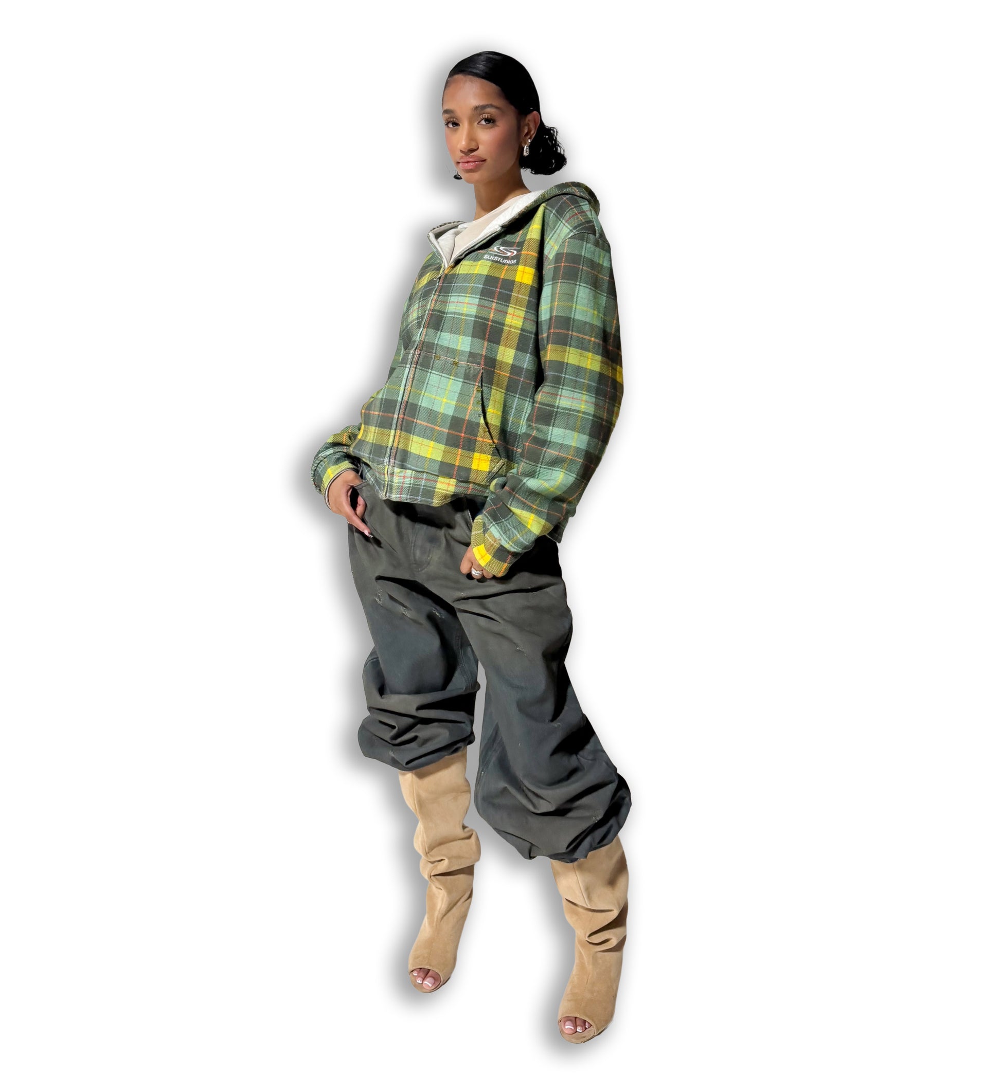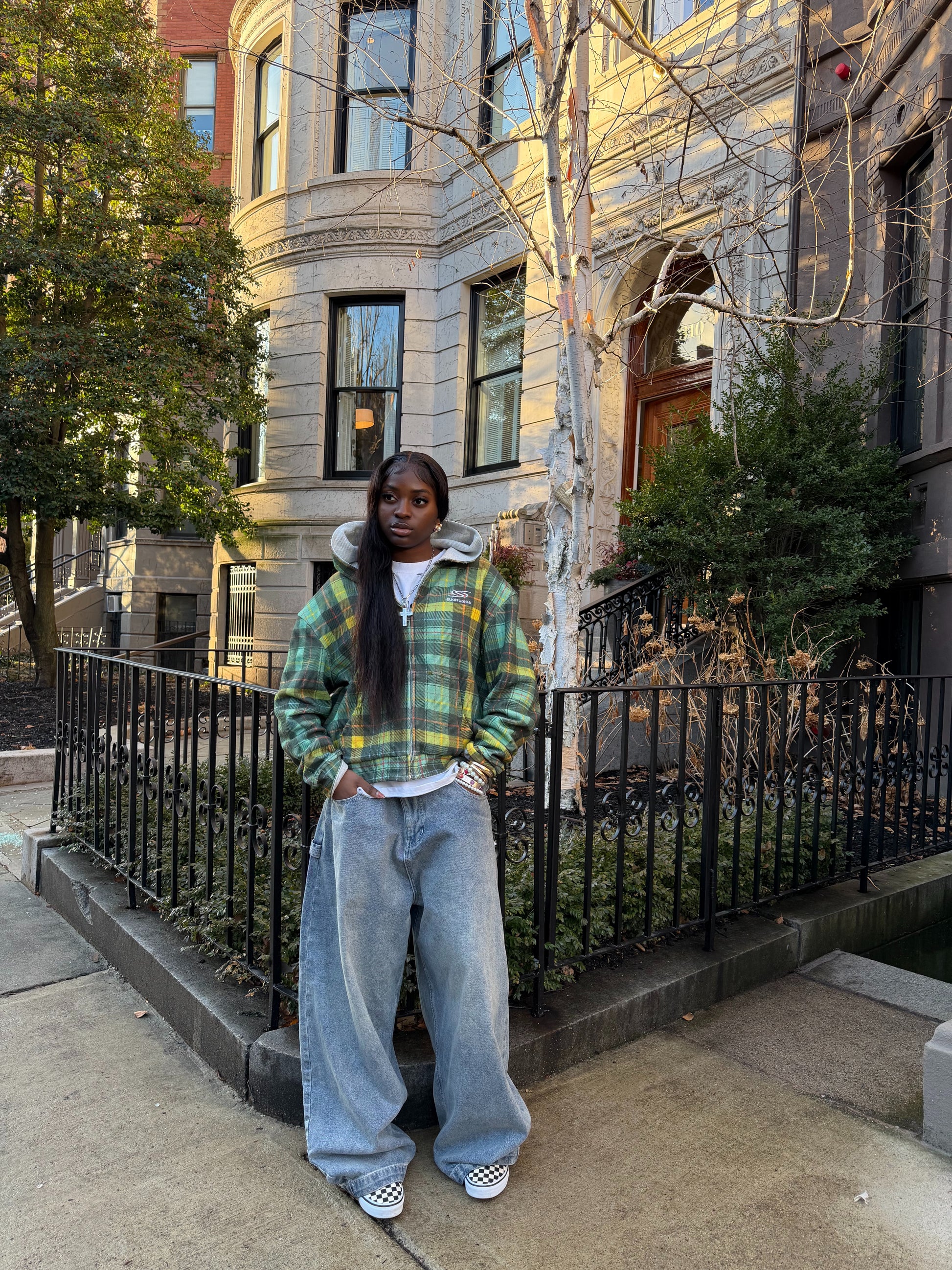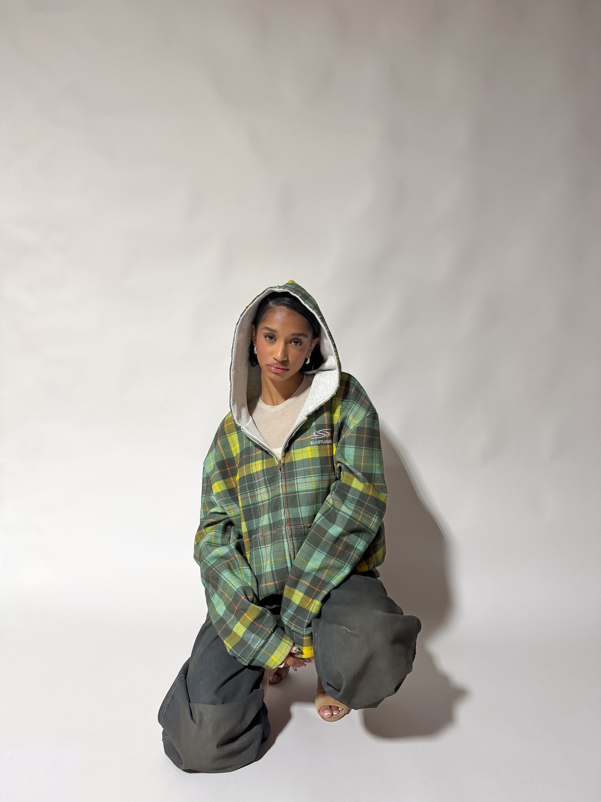- Reversible design: plaid exterior & solid textured knit interior